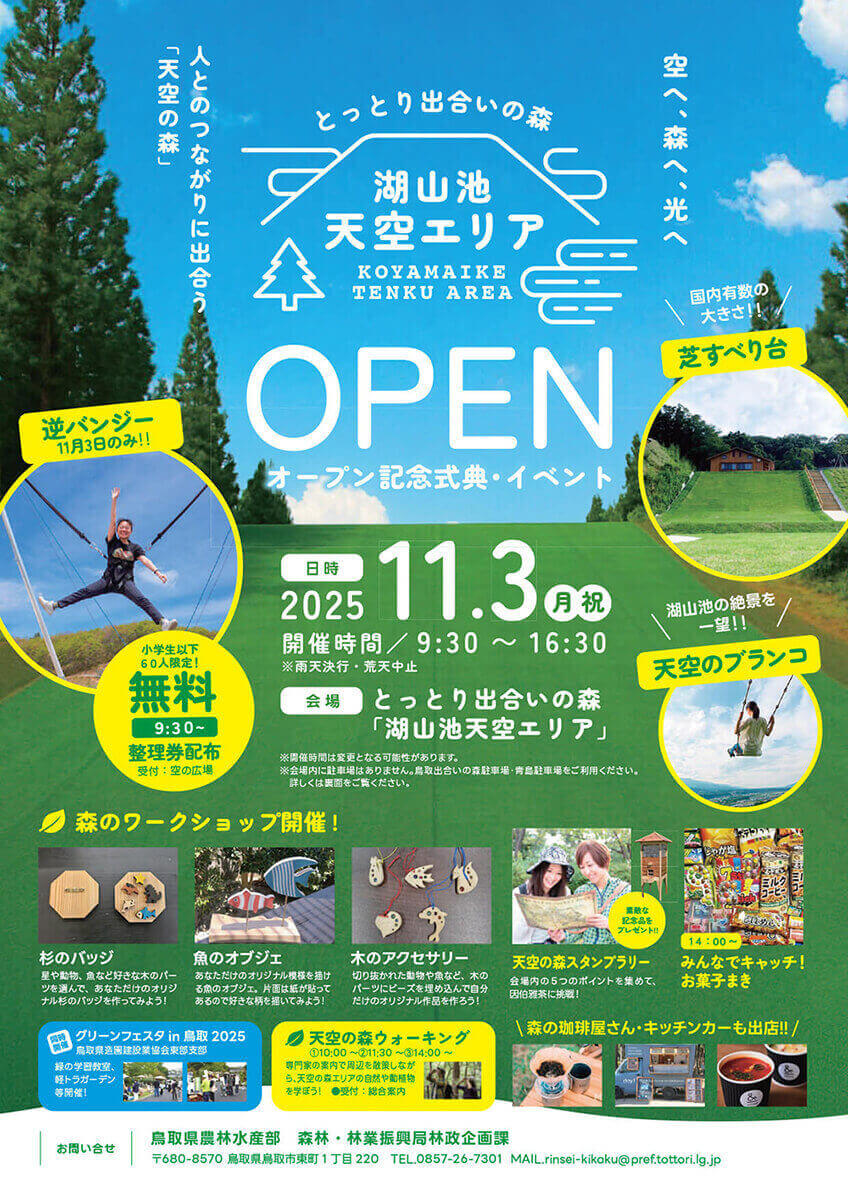 新エリア「湖山池天空エリア」が11月3日(月祝)にオープンし、記念式典を行います。 記念式典では、楽しいイベントももりだくさん! 楽しめること間違いなしです。