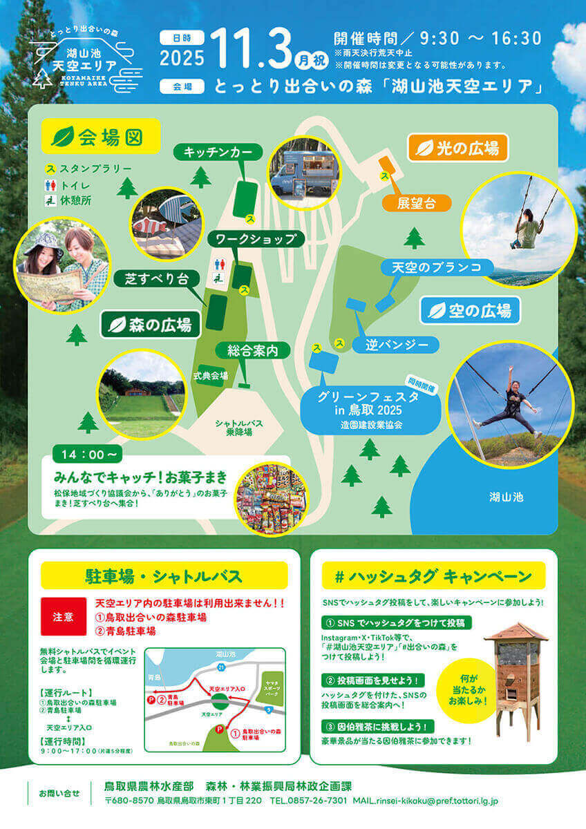 ◎オープン記念式典・イベント 日時:11月3日(月祝) 9:30〜16:30 会場:とっとり出合いの森「湖山池天空エリア」 旧少年自然の家 跡地