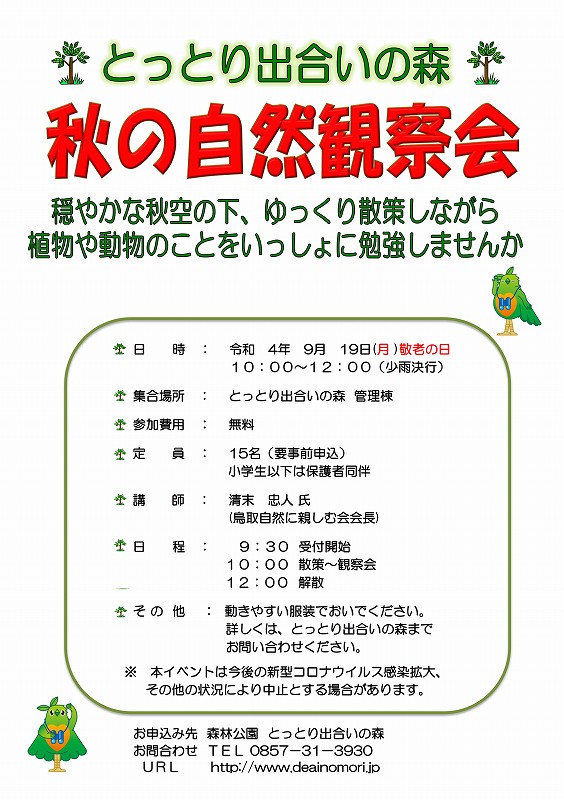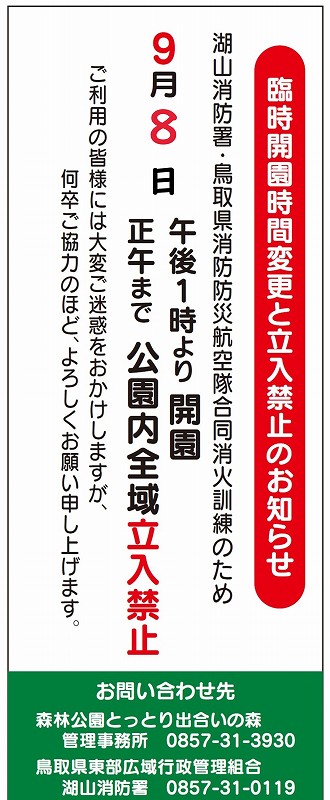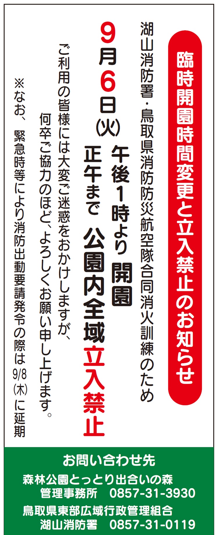 〇お問い合わせ先: ・森林公園とっとり出合いの森 管理事務所 0857-31-3930 ・鳥取県東部広域行政管理組合 湖山消防署 0857-31-0119