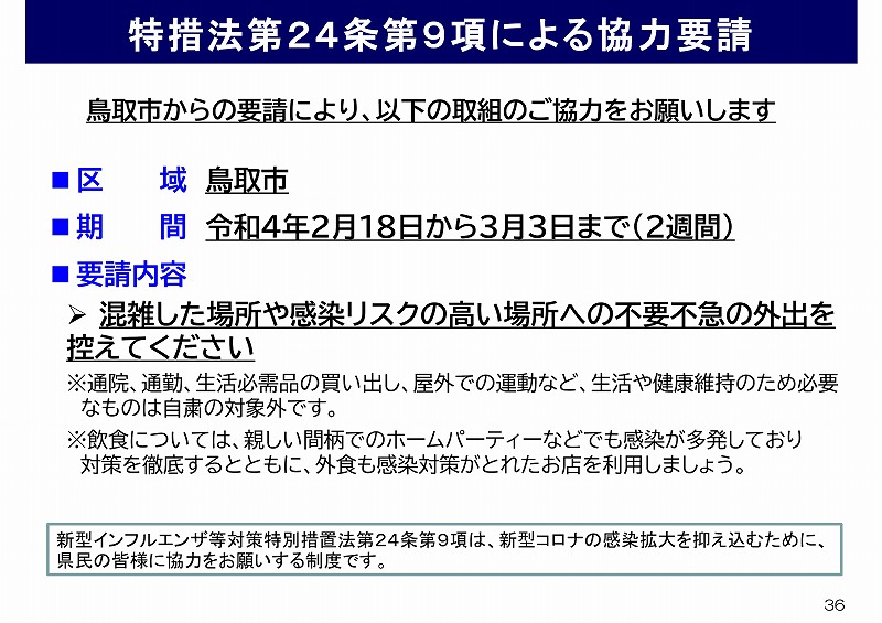区 域: 鳥取市 期 間: 令和4年2月18日から3月3日まで(2週間) 要請内容: 混雑した場所や感染リスクの高い場所への 不要不急の外出を控えてください