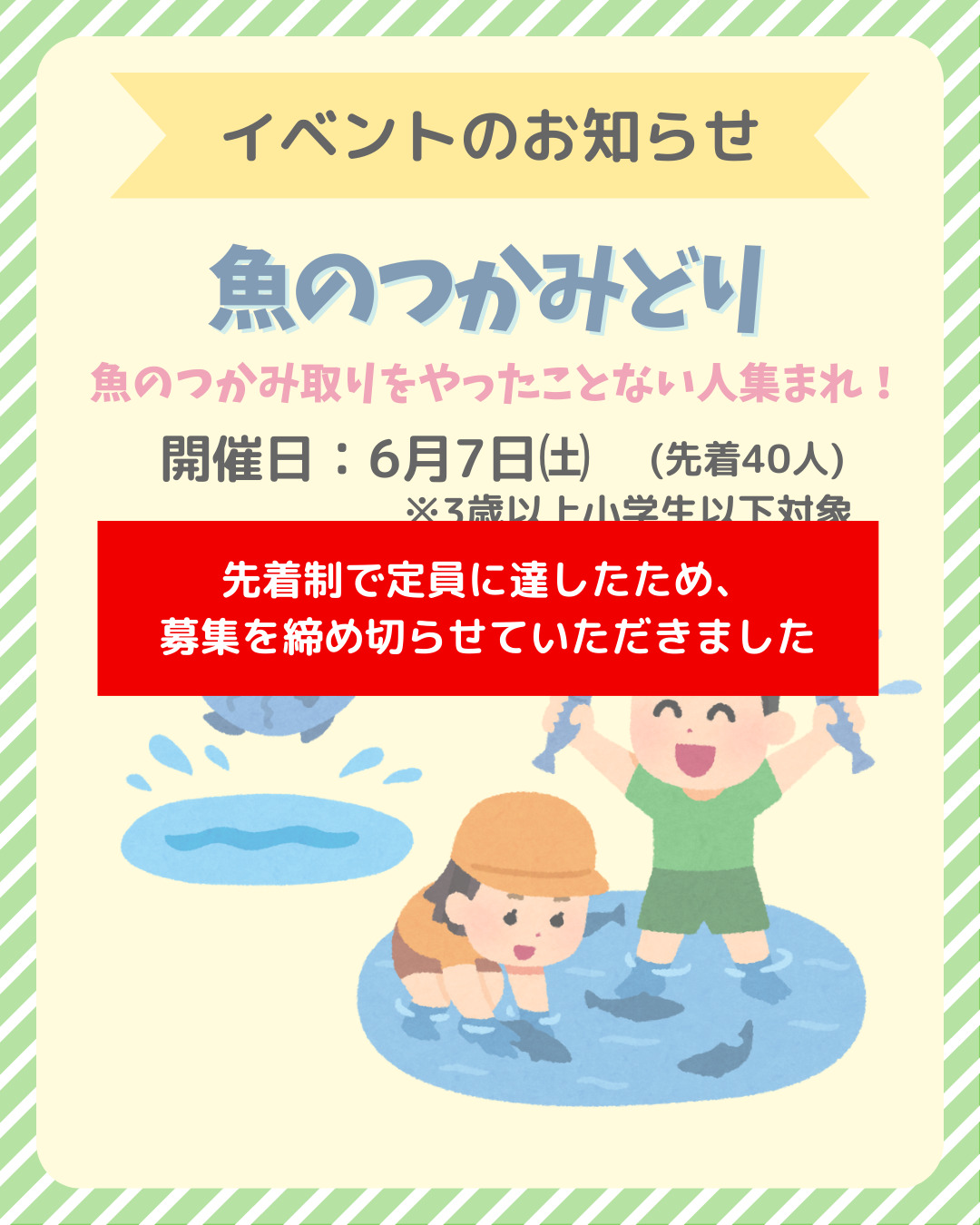 6月7日(土)に開催予定の「魚のつかみ取り」は満員御礼につき募集終了いたしました。