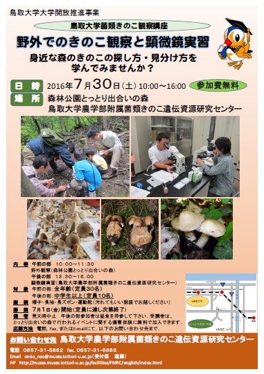 日 時 2016年7月30日(土)10:00〜16:00参加費無料 場 所 森林公園とっとり出合いの森 鳥取大学農学部附属菌類きのこ遺伝資源研究センター