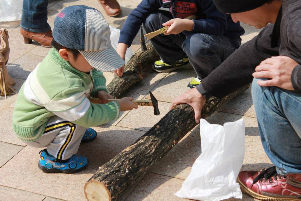 参加は約25名。暖かな春の陽気の中、講師のお話を聞きシイタケの勉強、そして公園内の支障木を使った原木(コナラ)に穴を開け、カナヅチでコンコンと駒菌を打ち込みました。