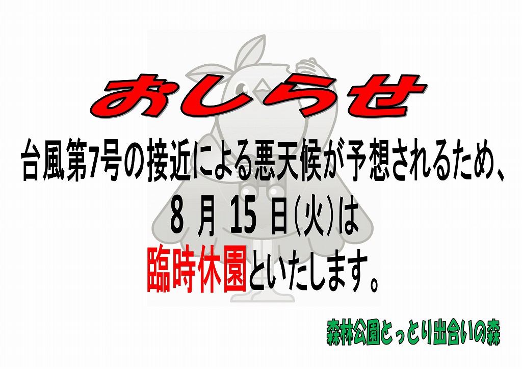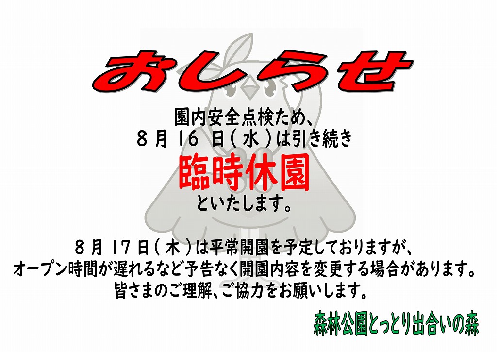 翌16日(水)に安全が確認できしだい開園いたしますので